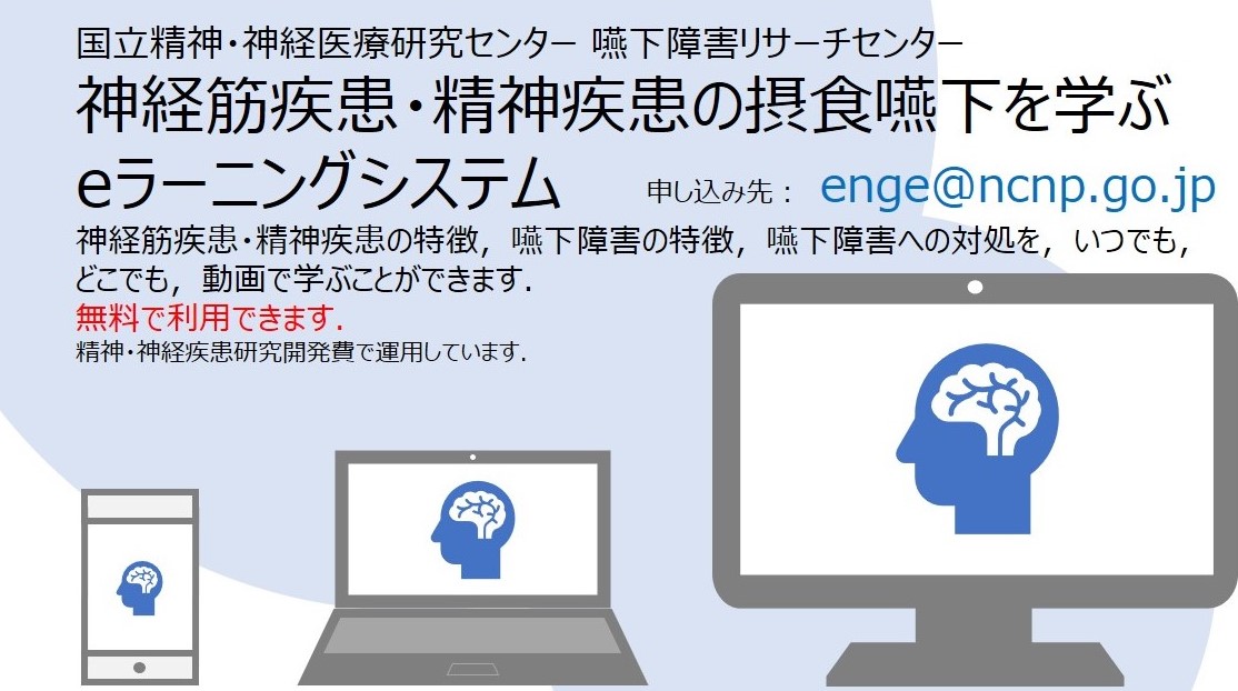 当研究会代表世話人である山本敏之がセンター長を務めます国立精神・神経医療研究センター 嚥下障害リサーチセンターが,神経筋疾患・精神疾患の特徴,嚥下障害の特徴,嚥下障害への対処を学ぶことが出来る,eラーニングシステムを運用開始致しました.医療従事者であればどなたでも無料でご利用いただけます.但し利用にはユーザー登録が必要なため,以下をご覧のうえ,お申し込みください.